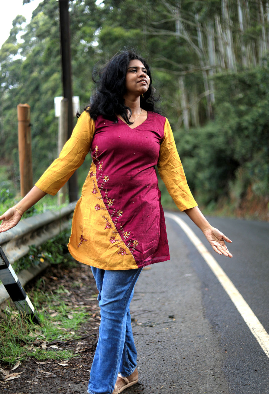 Rooted in craft and inspired by nature, this Wine & Mustard Hand Embroidered Two tone Kurti brings together Bright tones and timeless design. The kurti features a striking two-tone panelled silhouette, beautifully accented with delicate floral hand embroidery that flows diagonally across the front, adding depth and artisanal charm.